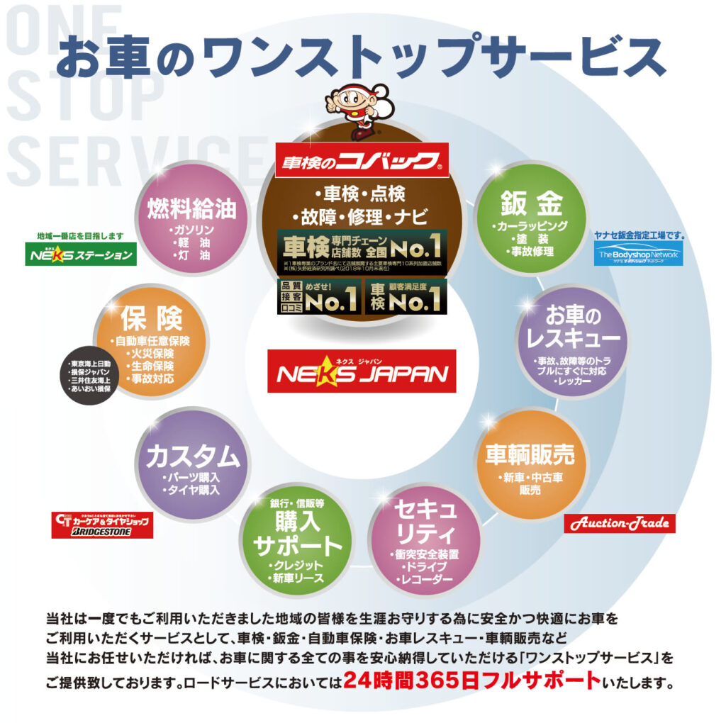 会社案内 経営理念 お客様第一主義 商売において顧客満足を利益・採算などよりもお客様の意向を重視していくという宣言。 事業コンセプト 社内イベント 仲間と楽しむ特別な時間!絆を深める社内イベントをたくさん開催しています。 社長挨拶 ご挨拶 弊社は、平成27年にKyoeiグループのグループ企業として操業を開始しました。創業当初は、由布市挟間にて鈑金・塗装・整備工場を開設しスタッフ約15名でスタートし、現在では、大分市田原にガソリンスタンド「ネクスステーション」、由布市挟間に車検の「コバック挟間店」、大分市松岡と稙田に車買取、販売「オークショントレード大分」現在では5店舗を運営しております。お客様にとってお車は、重要な生活のパートナーであり、趣味であり、大切なものであります。その大切なお車をトータルサポートしたいという強い想いがあります。一生のうちにお車にかかるコストは数千万ともいわれています。NEKSJAPANグループではお客様のお車をトータルサポートすることで一生のうちにかかるカーコストを下げるサポートをし、お客様のカーライフに貢献したいと社員一丸となり日々努力しております。今後とも地域の皆様にとって地域一番店であり続けられるよう、頑張ってまいります。 会社概要 会社名 株式会社NEKS JAPAN 会社所在地 大分県由布市挾間町挾間 771 番地5 設立 2015 年6 月 資本金 5,000,000 円 事業内容 車の販売・車の買取車検、整備、修理鈑金・塗装、カー用品販売、コーティング施工、カーフィルム施工各種保険業務燃料改善事業環境保全事業
